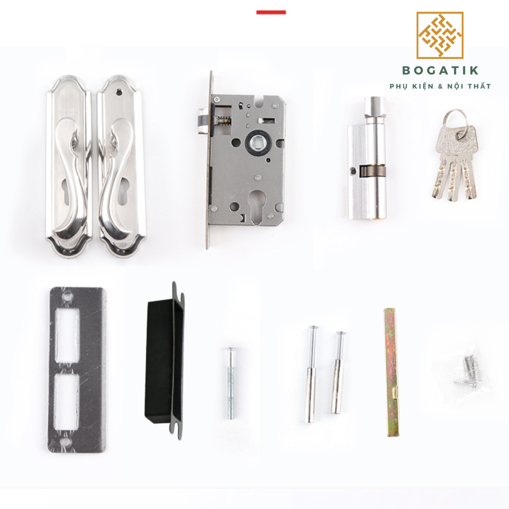 + Bộ khóa đầy đủ bao gồm 2 ốp khóa, thân khóa, chìa khóa, ốc vít,..