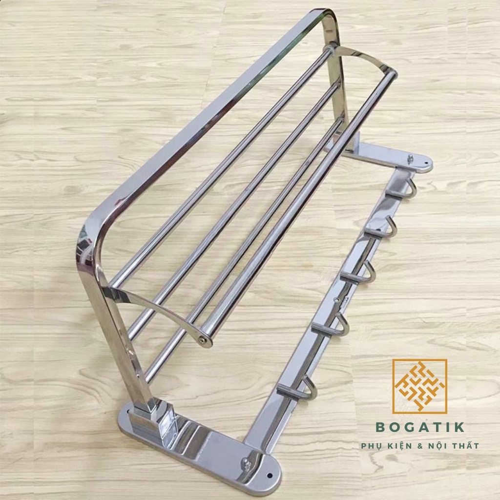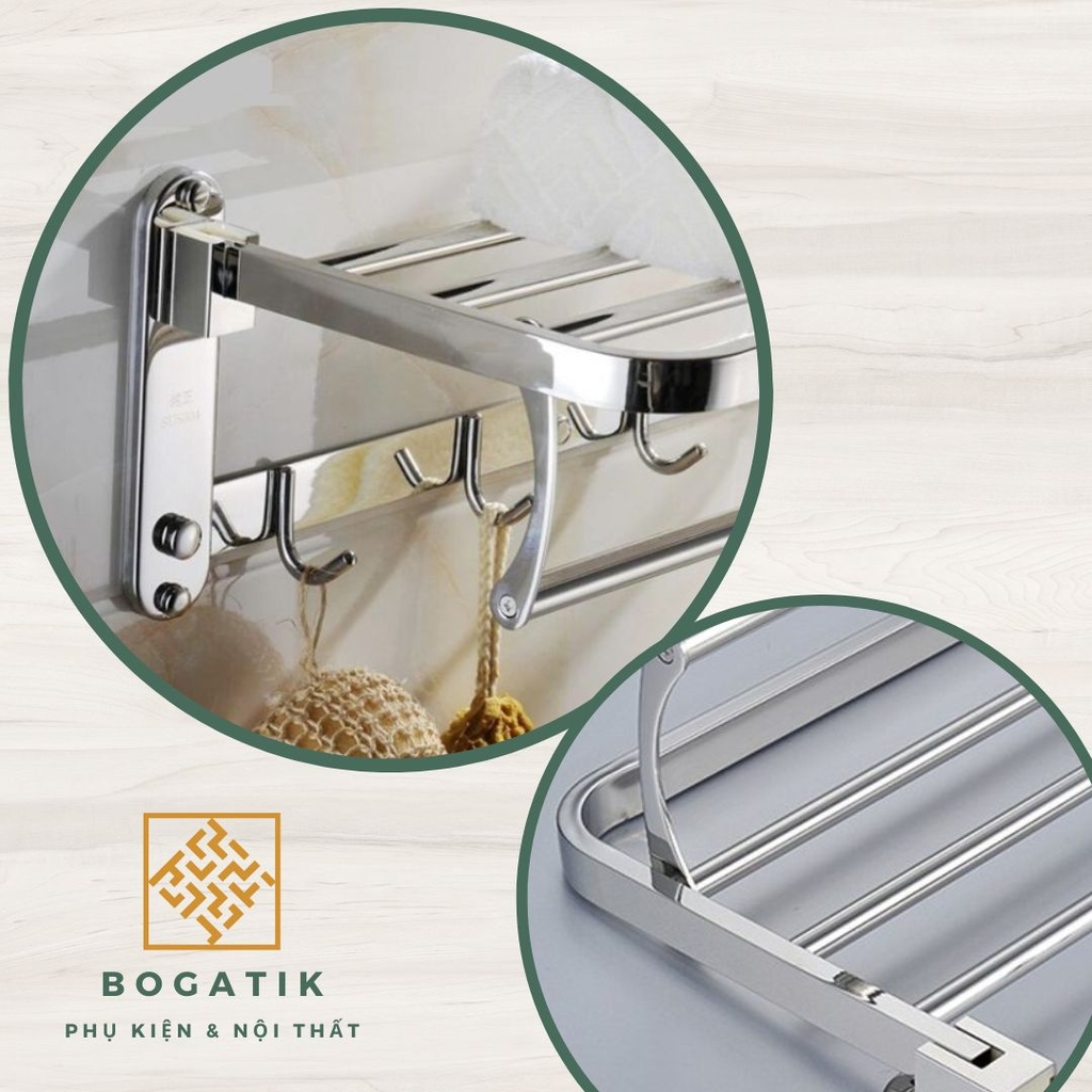 + Giá khăn rộng, để được rất nhiều đồ, có thể nâng hạ 90 độ thoải mái khi không sử dụng, giúp tiết kiệm không gian nhà tắm hiệu quả. Bên cạnh đó sản phẩm được bắn vít cố định vào tường nên rất chắc chắn, khách hàng có thể để đồ thoải mái không lo gãy hỏng.