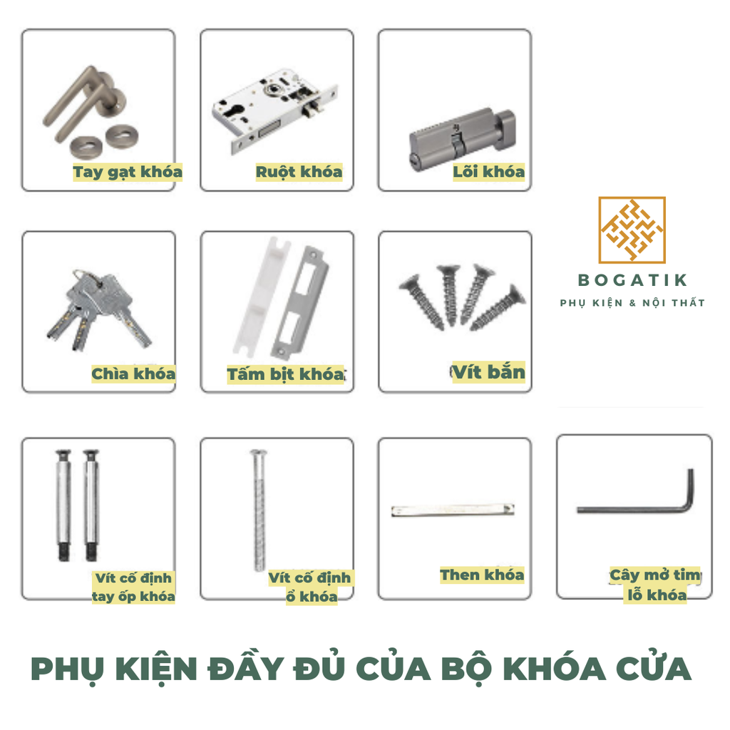+ Bộ khóa đầy đủ bao gồm 2 ốp khóa, thân khóa, chìa khóa, ốc vít,..