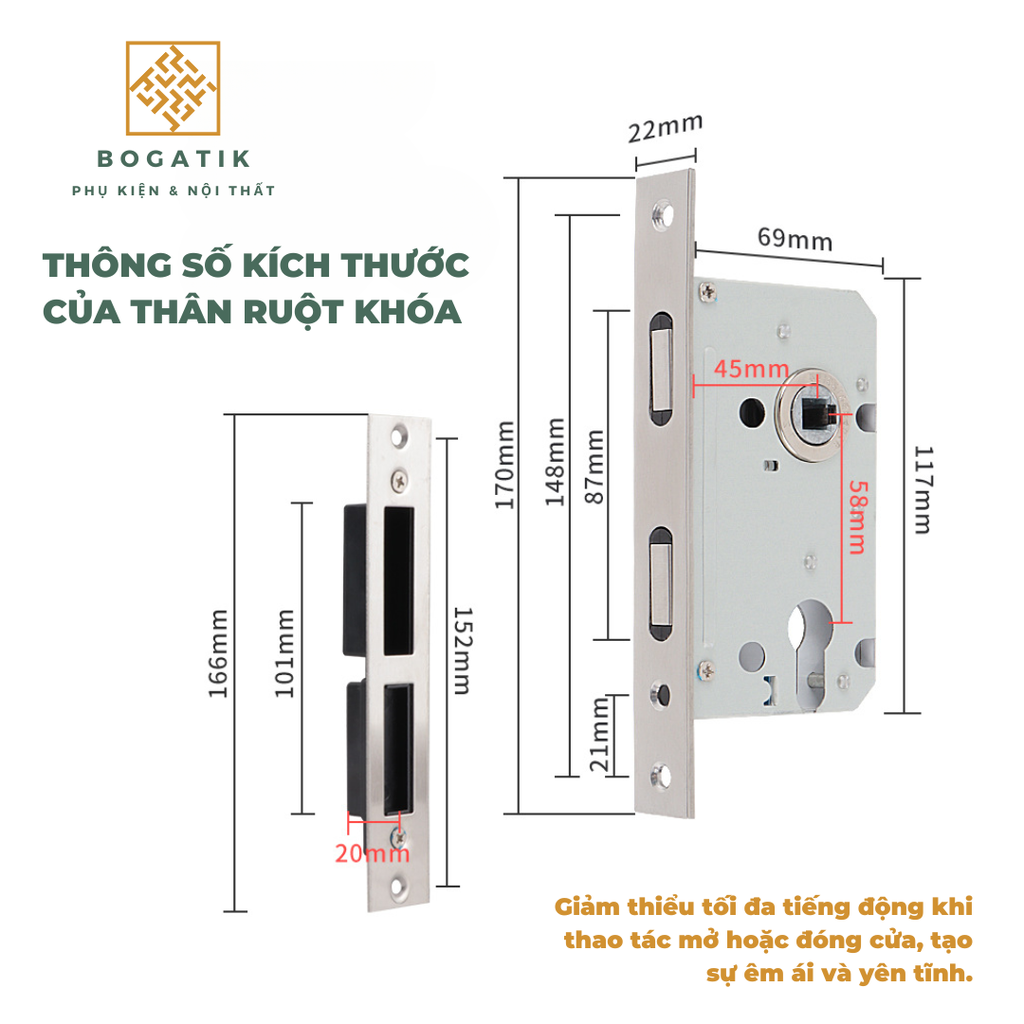 + Khoảng cách lỗ khóa trung tâm: 58mm.