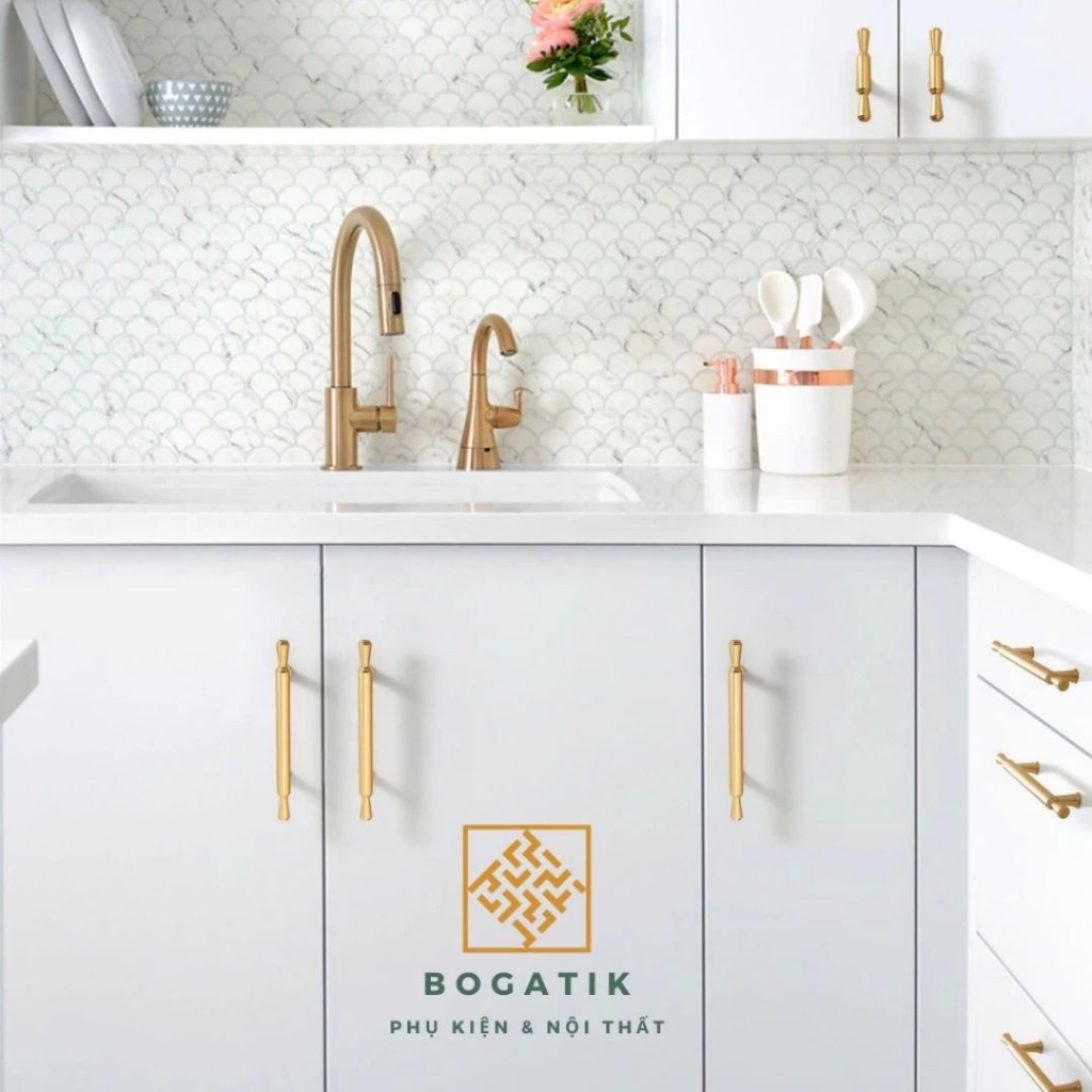 Tay nắm tủ màu vàng kim ánh sang tạo điểm nhấn nổi bật cho không gian, dễ dàng phối hợp với mọi phong cách nội thất từ hiện đại đến tân cổ điển.